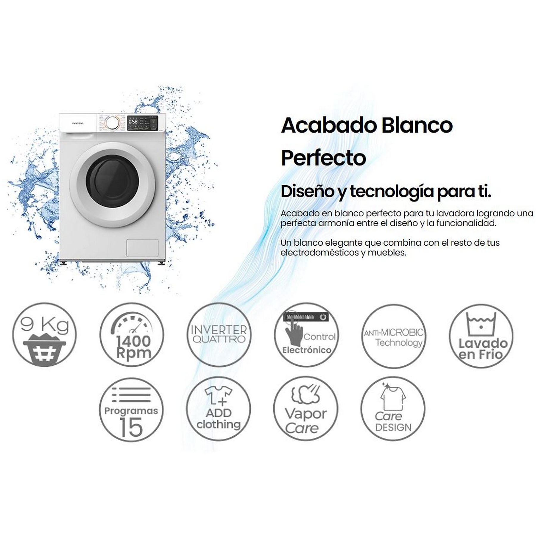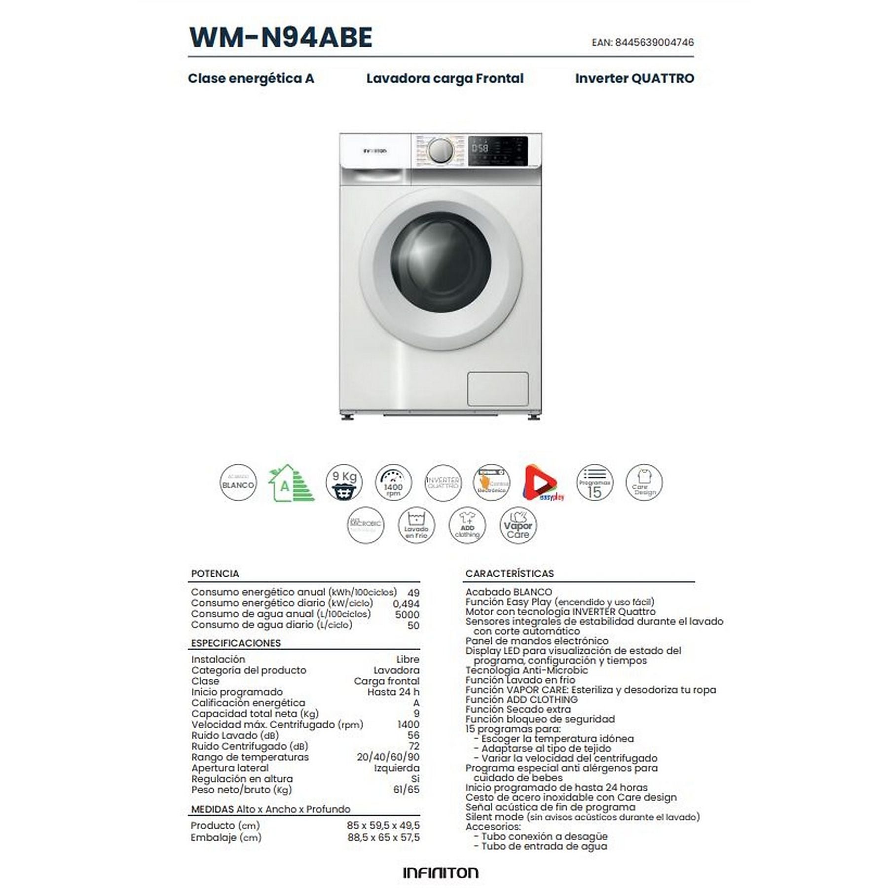 Lavadora Infiniton WM-N94ABE con capacidad de 9 kg, velocidad de centrifugado 1400 rpm, clase energética E, motor Inverter Quattro, función Vapor Care, 15 programas (incluye Anti-Alérgenos) y pantalla LED. Color blanco.