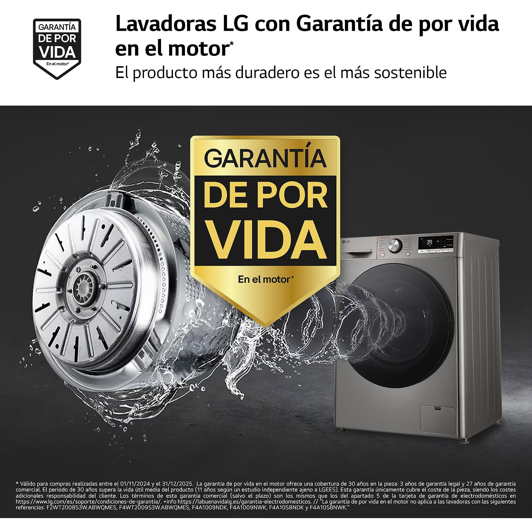 Lavadora LG Serie 700 F4WR7009AGS con capacidad de 9 kg, velocidad de centrifugado 1400 rpm (clase A), clase energética A, motor AI Direct Drive (30 años garantía), TurboWash 360° (39 min), Steam anti-alérgenos, Wi-Fi + app ThinQ y 14 programas. Acabado Inox antihuellas.