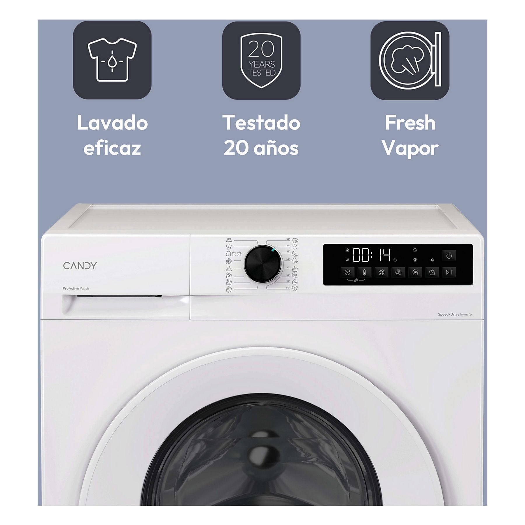 Lavadora secadora Candy GWD 4968-S con capacidad de lavado de 9 kg y secado de 6 kg, clase energética A, motor inverter, tecnología AI Silent Motion y función Fresh Vapor.