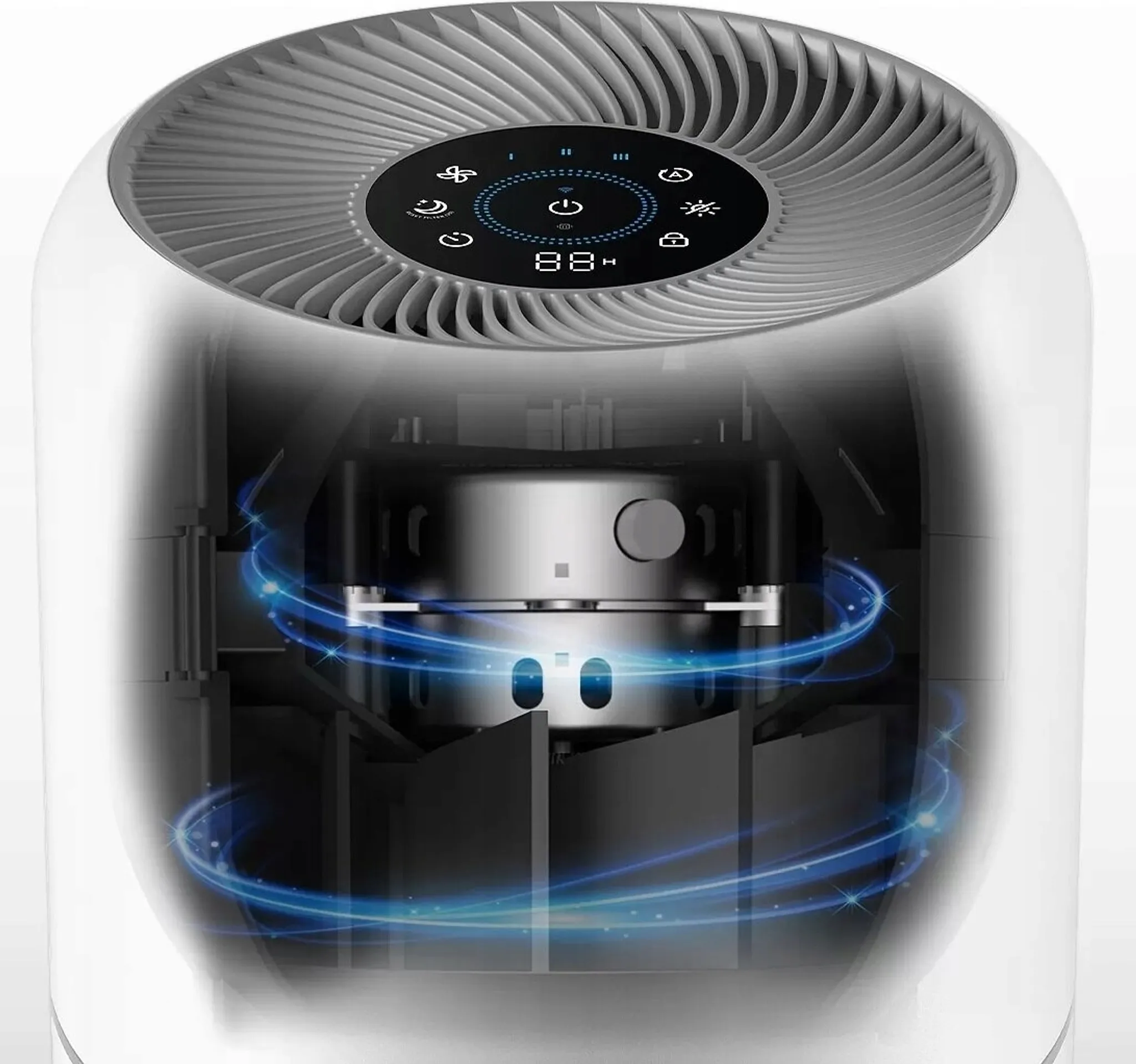 Su sistema de filtración en 3 etapas incluye prefiltro, filtro HEPA de alta eficiencia y carbón activado, lo que permite capturar tanto partículas finas como olores y gases nocivos (VOCs).