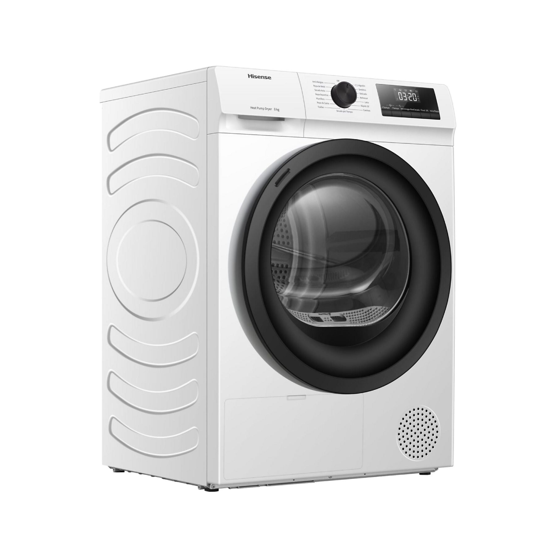 Secadora Hisense DHQE800BW2 con capacidad de 8 kg, bomba de calor, clase energética D (A++), 16 programas, Allergy Care, secado rápido 30 min, Auto-Dry, Anti-Arrugas y pantalla LED. Color blanco.