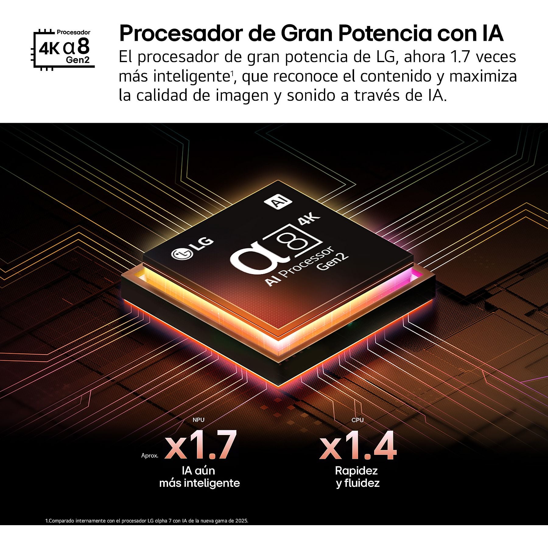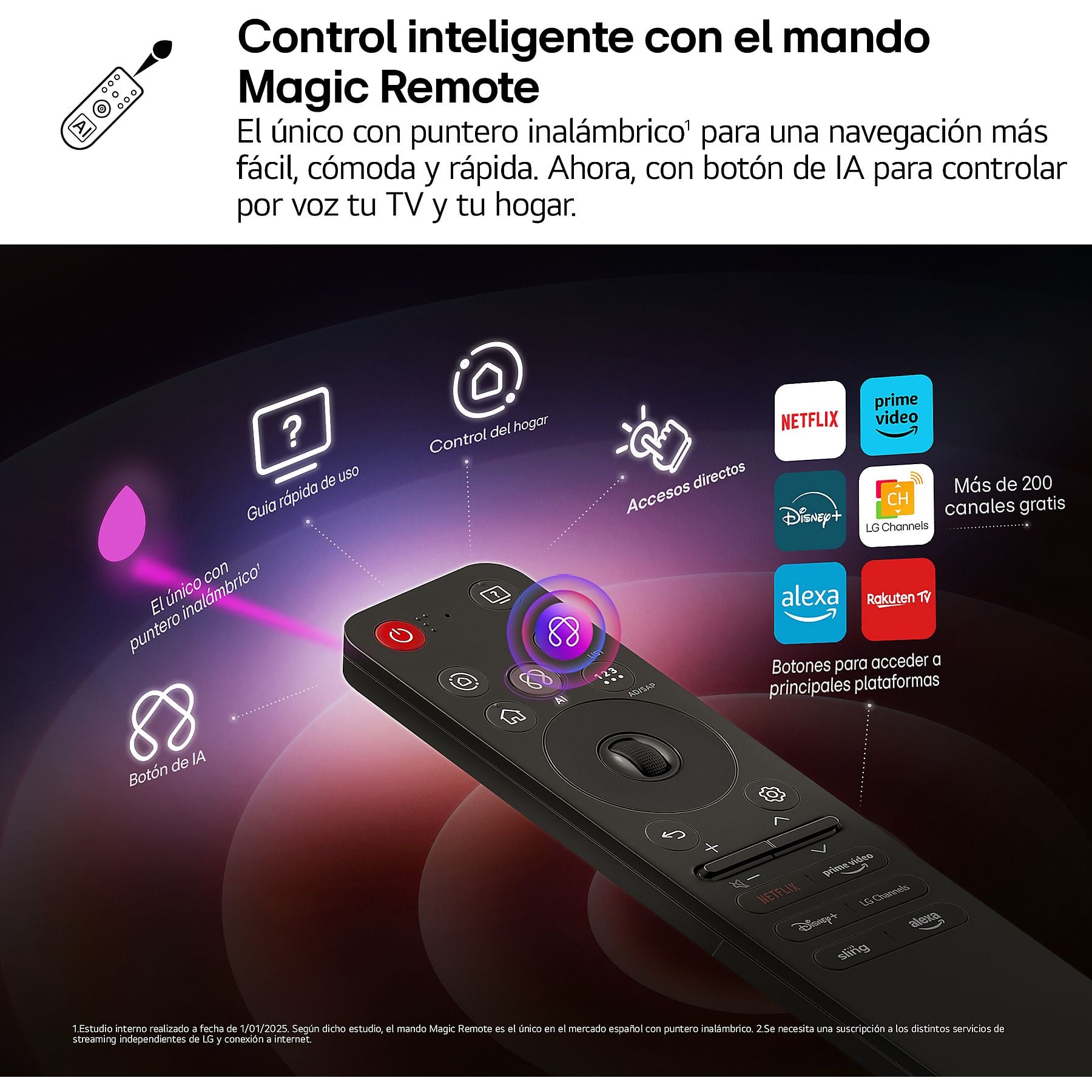 Como Smart TV, integra webOS 25, con acceso a aplicaciones, control por voz y funciones inteligentes. También incluye Magic Remote, compatibilidad con Apple AirPlay, Apple Home, Google Home y la app LG ThinQ, para una experiencia conectada y cómoda.