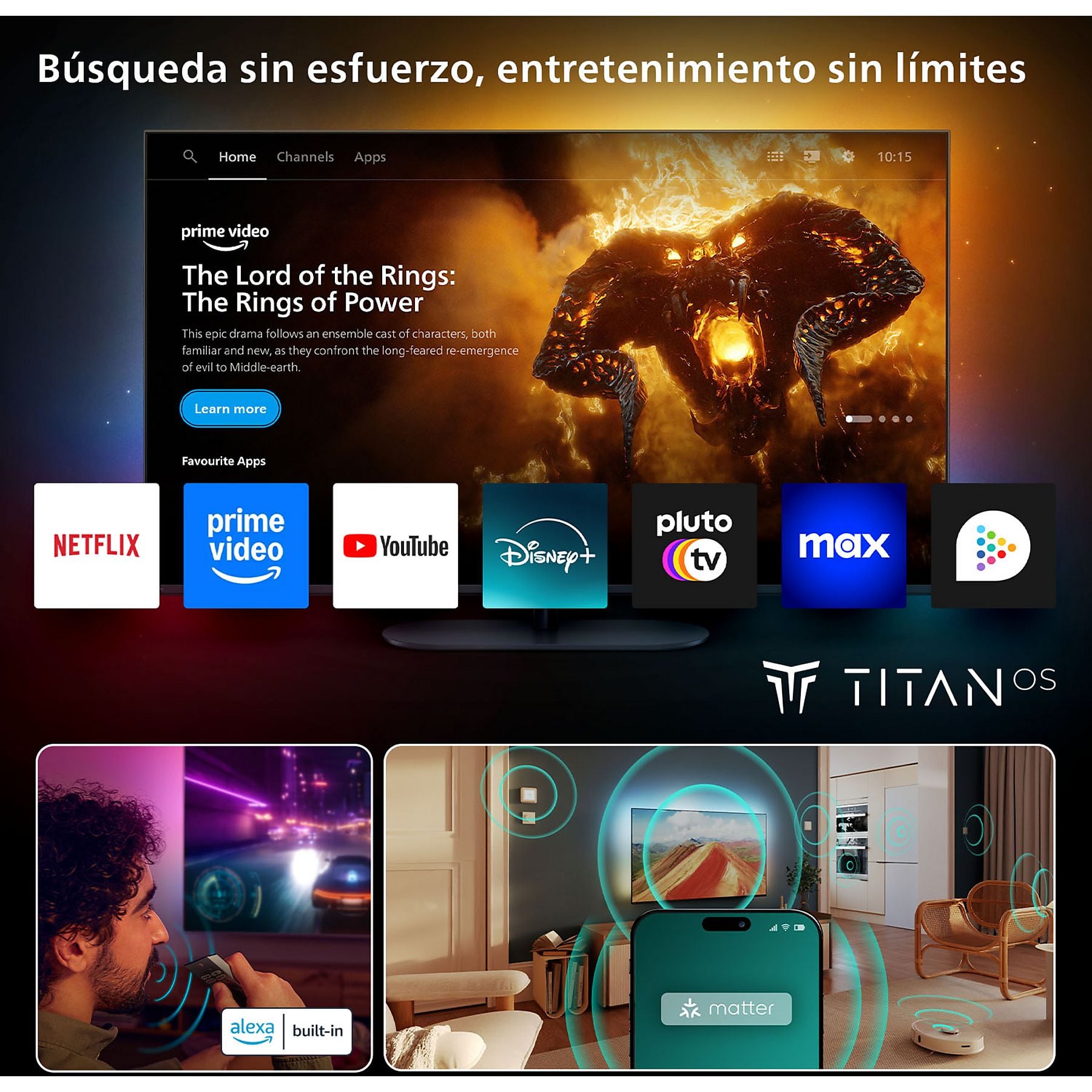 Como Smart TV, integra Titan OS, una plataforma rápida e intuitiva para acceder fácilmente a aplicaciones y contenidos. También es compatible con Amazon Alexa, Google Home, Apple AirPlay y Matter, facilitando su integración en el hogar conectado.